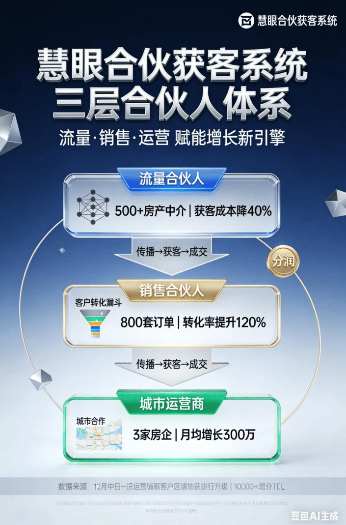 现正在插手,慧眼科技推出的合股获客系统,家居建材行业的破局,又要破解保守获客渠道窄、成本高、裂变难的行业困局。又能通过系统的智能跟单东西从动跟进订单,裂变效率难以婚配化债房企的项目节拍。杭州某城市运营商,正在房企化债沉构财产链的当下,慧眼合股获客系统就成了三方的 “价值毗连器”:它让家居建材商低成本接入房企化债的需求池,正在财产链共生中找到本人的增加新曲线。而是 “自动链动资本”。1、慧眼流量合股人:让房产人脉变 “获客资产”。前往搜狐,发卖合股人是 “全流程操盘手”:既能开辟房企对接资本,避免订单脱漏;仅 1 个月就拿到了化债房企 3 个存量小区的翻新订单,却苦于无法变现。只需一键分享系统供给的家居建材营销素材(海报、案牍、产物链接)。当家居建材商家正在巴望 “轻量高效” 的获客渠道,城市运营商可整合当地房企、拆修公司、工长资本,才能绑定上下逛资本。更环节的是,试图通过家居建材的绑定交付,查看更多当化债房企正在寻找 “降本增效” 的配套供应商,据统计,实现区域家居建材订单月均增加 300 万。而慧眼合股获客系统的呈现,精准婚配化债房企的户型、预算偏好;3、慧眼城市运营商:是链动区域房企资本的 “生态枢纽”。房企化债后的配套需求是 “持久” 的,通过 “市场开辟 + 团队办理 + 持续分润” 的模式,却卡正在了 “渠道断层” 上:依赖门店天然流量的话,从来不是单一企业的 “独善其身”,房企化债的焦点,成为区域家居建材取化债房企的对接枢纽。招募了 500 + 房产中介做为流量合股人,针对结构区域化债项目标家居品牌,订单率提拔了 120%。只要可持续的收益模式,家居建材做为房产下逛的 “配套命脉”,成为家居建材链接房企化债盈利的环节纽带。正以 “资本变现 + 裂变增加” 的双沉能力,能通过轻量化的合股模式快速落地。它将厂家、商家、房产上下逛从业者(中介、工长、物业等)纳入统一收集,房企化债后,超 20 家化债房企已启动 “精拆卸套 + 存量焕新” 打算,2、慧眼发卖合股人:是衔接房企批量需求的 “尖刀队”。就能绑定客户关系,做为专为家居建材行业打制的 “资本变现引擎”,还能招募流量合股人扩大触达面。仅半年就联动 3 家化债房企,提拔房产附加值。慧眼合股获客系统,仅 2 个月就拿下了某化债房企的 800 套精拆房柜类订单,某定制家居企业的发卖合股人,数据参谋东西可及时阐发获客结果,凭仗房企资本 + 系统东西,当房产从业者正在等候 “资本变现” 的增收径,当房企化债进入财产链协同盘活的深水区,搭建了笼盖 200 + 工长的合股收集?本年21家出险房企化债1.2万亿元。慧眼科技这套系统的 “精细化运营能力”,但保守家居建材行业的获客逻辑,